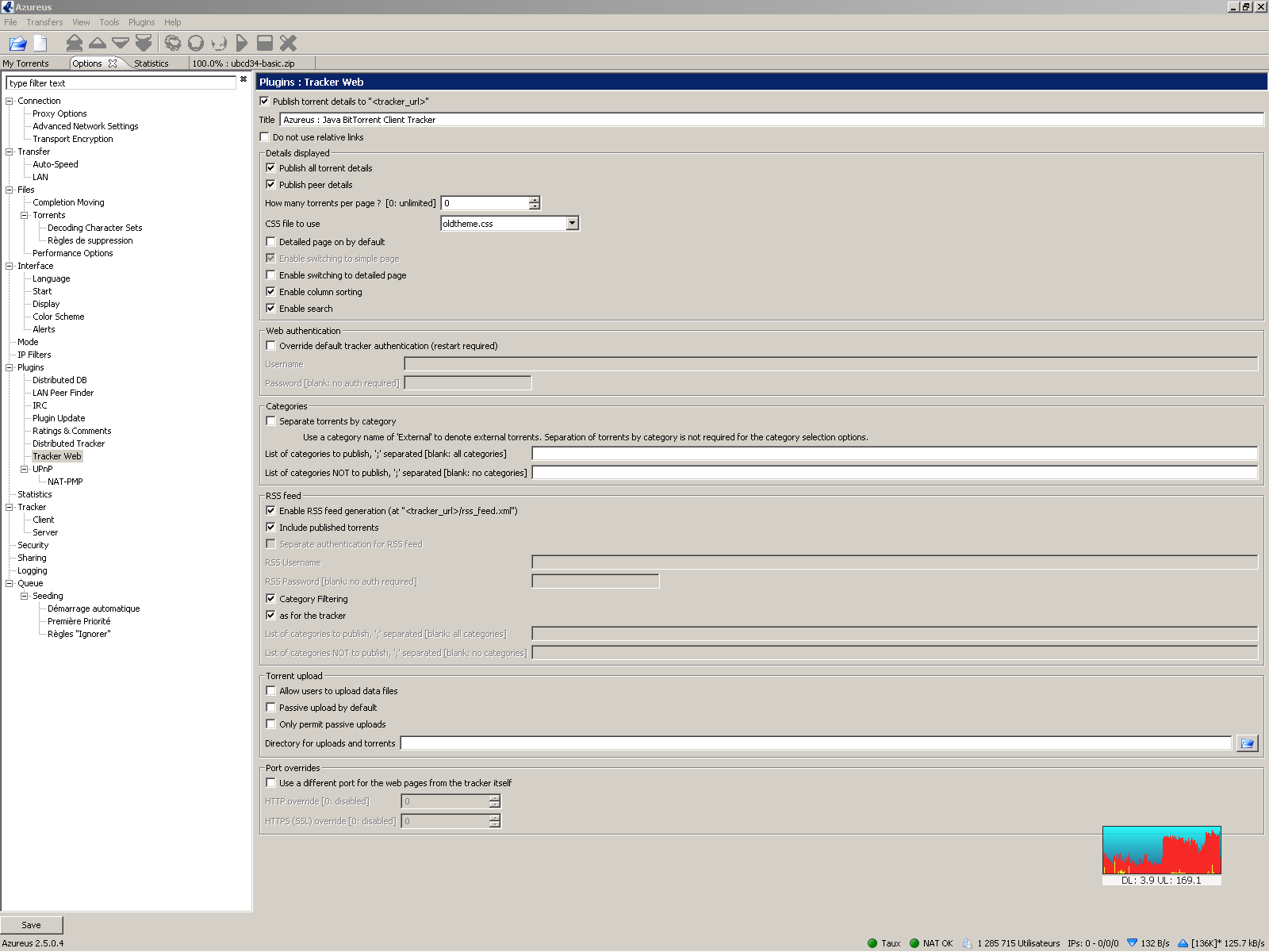 This is a follow-up on the previous configuration page. And it is important. I configured it for automatically adaptable performance (Azureus is astonishingly good at that). I only gave a minimum upload value to avoid seeing the upload drop to null too easily: 64 kB/s. Here, your choice of values is nearly as good as mine. I more or less chose to set it to half of the maximum capacity of the upload link here (about 120 kB/s in upload). But you could as well choose a somewhat smaller value (32 kB/s); Don’t expect any dramatic impact here.